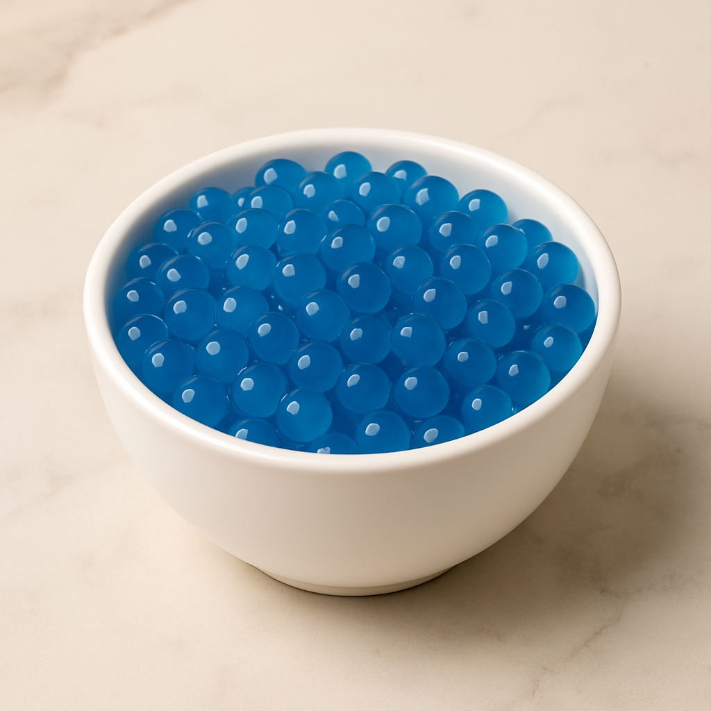 Canadian‑crafted 8 mm pearls bring a vivid blue hue and tangy raspberry flavour while remaining vegan, shelf‑stable, and Canadian-made for clean‑label appeal.